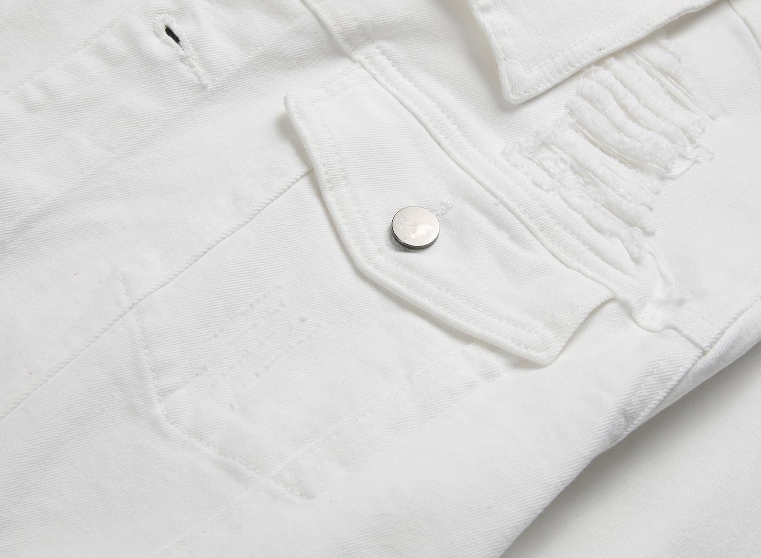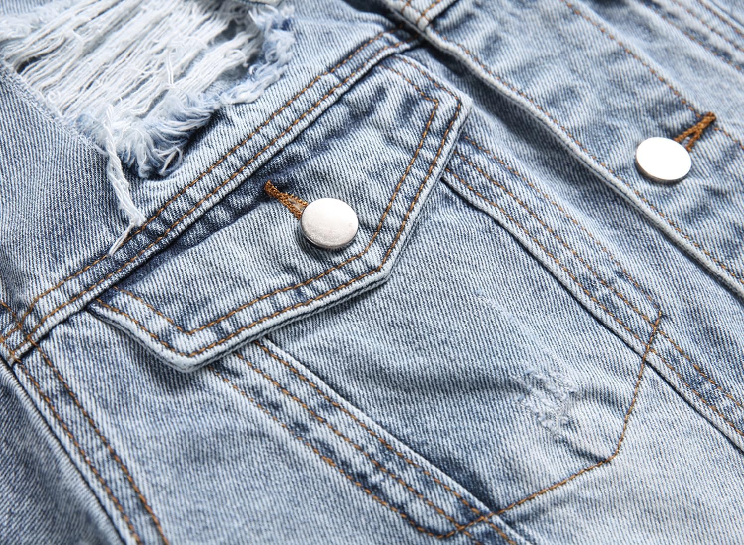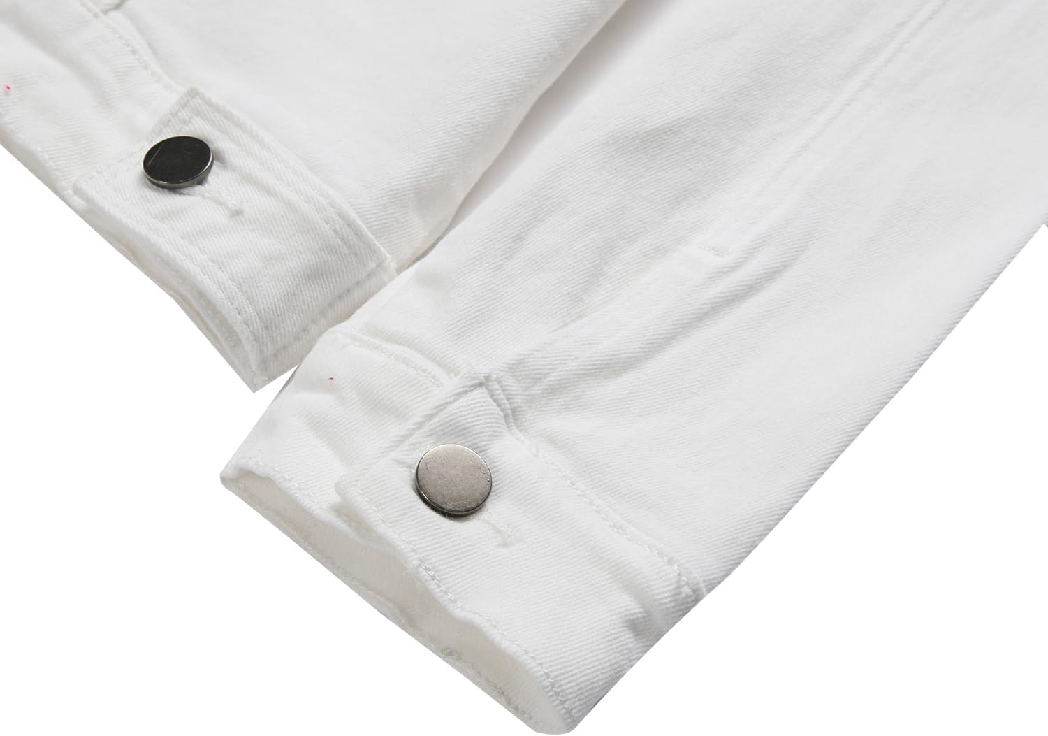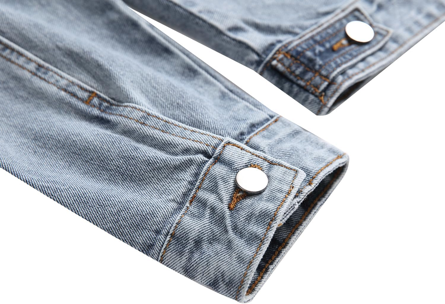 DESIGN FEATURES: Traditional jean jacket styling with button front closure, chest pockets, and adjustable button cuffs